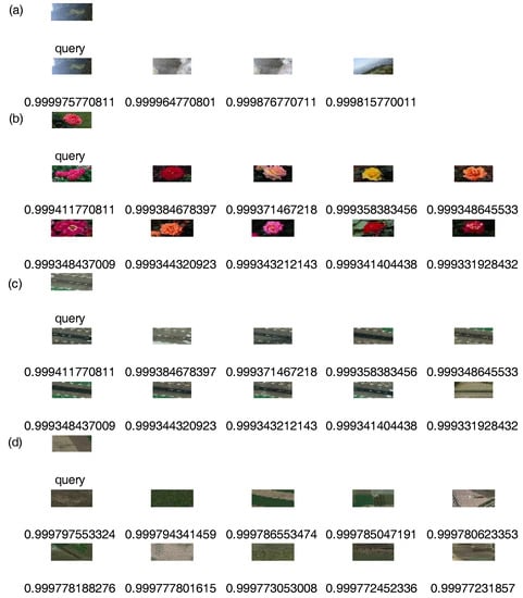 On Wang, UC Merced Land Use, and RSSCN7, one image was randomly selected as a query image and Top 10 retrieval results obtained by our method, respectively. On Holidays, one image was randomly selected as query image, respectively, and the Top 4 retrieval results obtained by our method. Figure 3 shows the retrieval results. The first image in the upper left corner is a query image that is labeled “query”. The remaining images are the corresponding similar images that are labeled by a similarity measure such as 0.999. In accordance with similarity from large to small, we arrange retrieval results from left to right and from top to bottom.