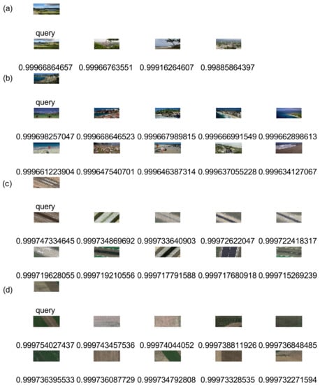 Similar to unsupervised state, on Wang, UC Merced Land Use, RSSCN7, one image was randomly selected as query image, Top 10 retrieval results were obtained by through our method, respectively. On Holidays, one image was randomly selected as query image, respectively, Top 4 retrieval results obtained by our method. Figure 5 shows the retrieval results. The first image in the upper left corner is a query image that is labeled “query”. The remaining images are the corresponding similar images that are labeled by similarity measure such as 0.999. In accordance with similarity from large to small, we arrange them from left to right and from top to bottom.