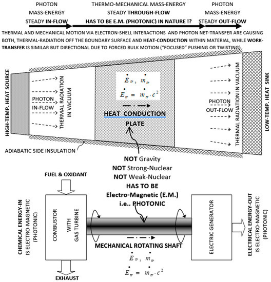 Electromagnetic nature of thermo-mechanical mass-energy transfer due to photon diffusive re-emission and propagation. Based on atomic electron-shell interactions and the Einstein mass-energy equivalence, during “believed-massless” heat conduction or mechanical work transfer there has to be electromagnetic, photonic mass-energy propagation through involved material structures from a mass-energy source to a sink system. Steady-state, mass-energy transfer is depicted through heat conduction plate (at Figure top) and rotating shaft (at Figure bottom). Energy transfer (i.e., Einstein’s mass-energy equivalency transfer, ) has to be electromagnetic by photon transfer, either as photon electromagnetic waves on-long range through space/vacuum (, or photon “on-contact” transfer (annihilation/reemission) within material structures, e.g., through heat conduction plate (at Figure top) and turbine shaft work (at Figure bottom), since it is neither gravitational nor nuclear (strong or weak) interaction. Otherwise, Einstein’s mass-energy equivalency and the fundamental force/interactions will be violated. Thermal conduction is due to chaotic thermal electron-shell collisions and may be enhanced by free-electrons or crystal-lattice structure vibration (phonons), both phenomena due to underlining photon propagation (similar to electro-chemical phenomena). The mechanical work transfer is due to electron-shell directional pushing/twisting as the most efficient (“focused”) energy transfer (i.e., mechanical super conductor). If it is fully investigated and understood, it has potential for development of hybrid synthetic-materials with superior thermal conductivity such as diamond and others, for critical and new applications [8].