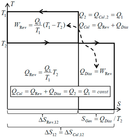 The irreversible work loss, i.e., work dissipation to generated heat (WLoss = WDiss = QGen) and entropy generation (SGen) are function of the initial and final process states’ properties only, and not of any other reference dead-state, as it might allude at first, since the combined system (A + B) is isolated from the surrounding, i.e., it comes to mutual equilibrium, and does not interact with the surrounding.