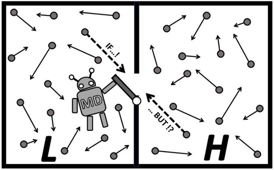 The most crucial fact, that the integral, chaotic and simultaneous interactions of all thermal particles on the MD’s operation, has been overlooked, but focus on a single, opportunistic particle motion is emphasized, as if the other thermal particles would not interfere, see Figure 5. Due effort to suppress such forced interference of other thermal particles would amount to required, major “due-work” to establish a macro non-equilibrium, which is independent and in addition to auxiliary “gate-work” of MD to observe molecules and operate a gate. The former, thermodynamic due-work, is unavoidable and substantial, while the latter, MD’s operational work, could be infinitesimally small if the MD’s operation is perfected to near-reversible actions, thus making delusion of the Second law violation.