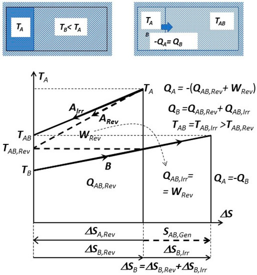Irreversible versus reversible process towards mutual equilibrium is presented on Figure 7. The isolated, combined system (parts A and B) is initially at non-equilibrium (TB < TA). The mutual work-potential (WRev) is fully dissipated with related entropy generation (SAB,Gen) during the irreversible process leading to mutual equilibrium at TAB = TAB,Irr.