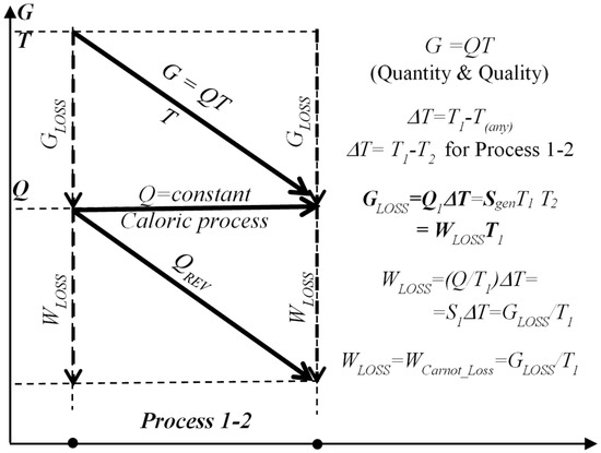 Furthermore, the “entransy of work”, GW, is also essential to be defined for processes when thermal heat is converted to work, such as in heat engines. The work entransy could be defined using the entransy balance for reversible, Carnot cycle relationship, and considering that there is no entransy loss in an ideal reversible process, i.e., GIN = GOUT or G1 = GW + G2 (notation in [18]):