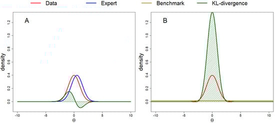 To illustrate this, consider the following limiting case. Imagine an expert who believes that they are infinitely certain about the future. This expert should then specify their prior in the form of a Dirac delta function , also called the degenerate distribution on the real line, which has density zero everywhere for except for where it has infinite density []. Moreover, the delta function actually integrates to one and in that sense is a proper prior which can also be viewed as an infinitely narrow Gaussian []. Now, if an expert states their prior belief in the form of a delta function and coincides with a region of where the likelihood , both the marginal likelihood and will become infinite. The meaning could, however, not differ any more. The marginal likelihood suggests that this expert is the best possible expert, whilst the KL divergence suggests that there is no worse expert. Although this scenario is quite extreme, van de Schoot, Griffioen and Winter [] did encounter such an expert in their elicitation endeavors.