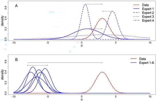 Scenarios in which there are multiple experts and one source of data. (A) shows experts differing in prediction and (un)certainty, all (dis)agreeing to a certain extent with the data; (B) shows a scenario in which all experts disagree with the data, which results in the question of which of the sources of information is correct.