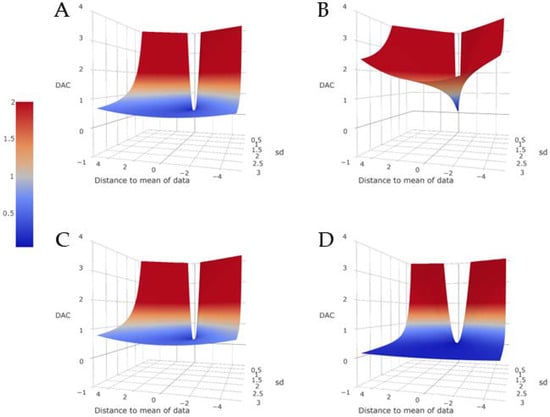 Concerning the benchmark, it is useful to note that the benchmark need not be restricted to an uninformative prior, but using an informative prior changes the interpretation and behavior of the DAC. When is informative, is sensitive to the specification of and the KL divergence between and need no longer be stable, potentially influencing the ranking of the experts. To show the above described behavior visually, we present the results of a simulation study in Figure 4. We show four different conditions, that is, four different choices for benchmark priors, to illustrate the change in behavior for the DACd. In all four situations, we use the same data, y, which is a sample of 100 from a standard normal distribution with a sample mean . is the density and we show the values for and . The four panels show different conditions for the benchmarks such that, in Figure 4A, it is the density, in Figure 4B, the density, in Figure 4C, the density and in Figure 4D the density. It can be seen that, for the two uninformative priors in Figure 4A,C, the behavior of the is stable. We would expect to draw the same conclusions and rank experts in the same way independent of the choice of either benchmark. However, when we specify an informative benchmark such as in Figure 4B,D, we see that both the behavior of the and the determination of prior-data (dis)agreement shift. In Figure 4B, an informative and accurate benchmark leads almost invariably to concluding prior-data disagreement for . In Figure 4D, the informative but inaccurate benchmark leads us to conclude prior-data disagreement only if is in the wrong location and has a very small variance.