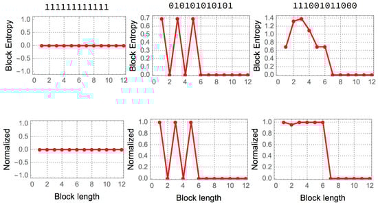 The best version of Shannon entropy can be rewritten as a function of variable block length where the minimum value best captures the (possible) periodicity of a string here illustrated with three strings of length 12, regular, periodic and random-looking. Because blocks larger than would result in only one block and therefore entropy equal to 0, the largest possible block is . The normalized version (bottom) divides the entropy value for that block size by the largest possible number of blocks for that size and alphabet (here binary).