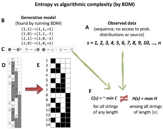 However, no matter how sophisticated a version or variation of an Entropic measure will characterize certain algorithmic aspects of data that are not random but will appear to have maximal entropy if no knowledge about the source is known. In Figure 3 depicted is how algorithmic probability/complexity can find such patterns and ultimately characterize any, including statistical ones, thereby offering a generalization and complementary improvement to the application of Entropy alone.