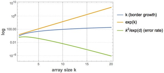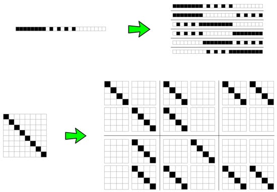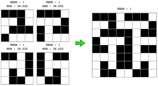 Figure 4 shows that the number of permutations is a function of the complexity of the original object, with the number of permutations growing in proportion to the original object’s entropy—because the number of different resulting blocks determines the number of different n objects to distribute among the size of the original object (e.g., 3 among 3 in Figure 4 (top) or only 2 different blocks in Figure 4 (bottom)). This means that the non-overlapping version of BDM is not invariant vis-à-vis the variation of the entropy of the object, on account of which it has a different impact on the error introduced in the estimation of the algorithmic complexity of the object. Thus, non-overlapping objects of low complexity will have little impact, but with random objects non-overlapping increases inaccuracy. Overlapping decomposition solves this particular permutation issue by decreasing the number of possible permutations, in order to avoid trivial assignment of the same BDM values. However, overlapping has the undesired effect of systematically overestimating values of algorithmic complexity by counting almost every object of size n, times, hence overestimating at a rate of about for high complexity objects of which the block multiplicity will be low, and by for low complexity objects.