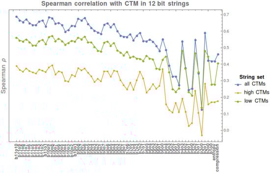 Validations of CTM undertaken before show the correspondence between CTM values and the exact number of instructions used by Turing machines when running to calculate CTM [] (Figure 1 and Table 1) to produce each string, i.e., direct K complexity values for this model of computation (as opposed to CTM using algorithmic probability and the Coding theorem) under the chosen model of computation []. The correspondence in values found between the directly calculated K and CTM by way of frequency production was near perfect.