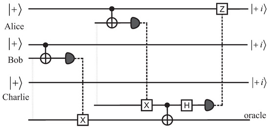 In the scheme of Figure 1, two ancilla qubits are used to implement the non-local parity measurement. They are prepared in an entangled state and they serve as the target qubits of the local CNOT gates with the states as a control. The CNOT gates are local and could be realized by local interactions between the target qubit and the auxiliary qubits. The results of the measurements on the ancilla qubits are then transmitted in the form of classical bits of information to a coincidence counter which is implemented as a classical XOR gate. It is straigthforward to verify that a value of 0 for the oracle bit at the output of the XOR gate corresponds to the measurement operator , while a value of 1 corresponds to , see Equations (1) and (). Interestingly, through the use of CNOT gates—which condition the state of the ancillas on the qubits that we want to measure—this scheme converts a quantum parity measurement into a classical parity evaluation by an XOR gate.