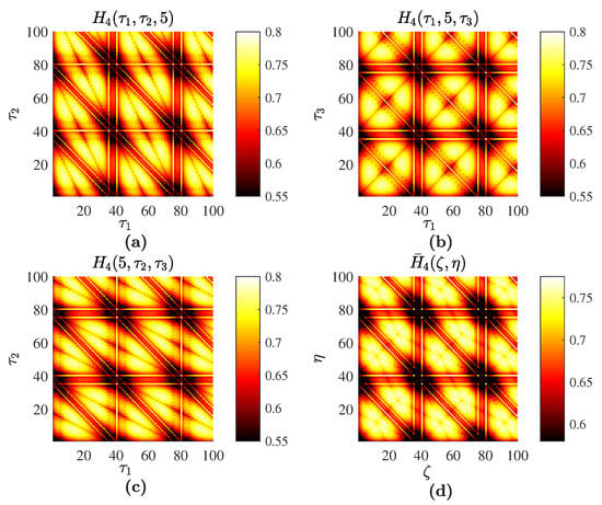 Note that only two different time delays are not fixed in each plane projection of . In other words, is a two-dimensional image of PE when all time delays , , , are fixed to the corresponding components of the vector of optimal time delays. Finally, a two-dimensional averaged digital image of PE is computed as an arithmetic average of all planar PE images. The upper range L should be high enough to ensure that the maximum point of the target function (Equation (5)) does not lie on the boundary of the search space (all optimal time lags should be lower than L).