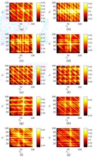 It can be seen that particular values of time delays do have a strong impact on the averaged pattern of PE. The averaged PE inherits the properties of individual planar sections of PE. The geometric coordinates of the particular set of time delays in the multi-dimensional coordinate space define specific features of planar projections, which influence the averaged image. The high-PE bands at delays of 60 are still clearly expressed in Figure 5a,b. However, the averaged PE patterns are very much different; and the proposed technique for plotting the averaged PE is particularly based on the set of optimal time delays.