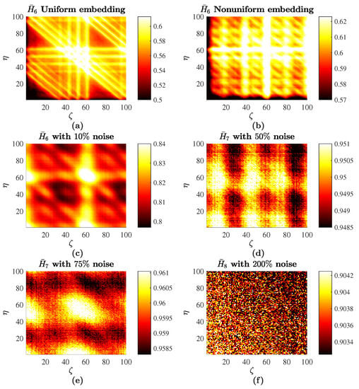 All real-world time series are contaminated by noise. Therefore, it is important to investigate the effects induced by noise on the proposed scheme of PE visualization. Computational experiments are continued with the Rössler time series, but different realizations of the Gaussian random noise with zero mean are added to it. The standard deviation of the random noise is set to , where is the noise level in percent; R is the range of the stationary Rössler time series (the difference between the maximum and the minimum values of the time series in the observation window). for the Rössler time series with different noise levels are depicted in Figure 4 (intermediate images of all possible plain projections of PE are omitted for brevity). The deterministic components of PE are gradually lost when the signal is completely buried in noise. with 200% noise (Figure 4f) represents the image of random noise. It is known that PE is robust to noise []. However, the amount of noise added to the deterministic time series is so high that the time series becomes a random time series and correlations between data points are lost completely. It is interesting to observe that the average PE is more acutely impacted by noise when one of the coordinates () is low. Note that the addition of noise to the deterministic system induces the change of the optimal embedding dimension and optimal delays in the resulting time series. Therefore, the optimal embedding dimension and the set of optimal time delays are reconstructed for every different noise level (Table 2). Though PE is not a good measure to quantify the structural complexity, it is well suited to assess the randomness of a time series (PE increases with respect to noise level) []. This effect is clearly observed in Figure 4 when the range of PE raises from up to .