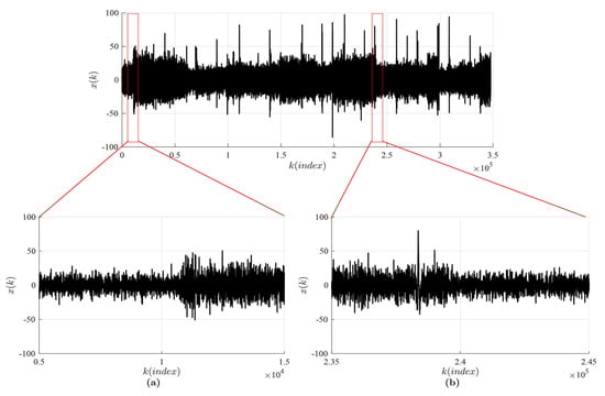 Computational experiments are continued with the EEG signal available from the Brain/Neural Computer Interaction (BNCI) Horizon 2020 project [] (A01 time series from dataset P300 Speller); the graphical representation of the signal is shown in Figure 6.