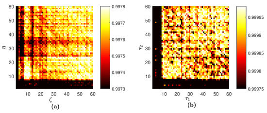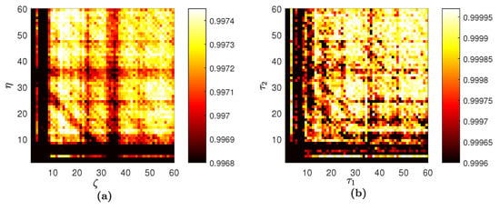 Computational experiments are continued with Interval A, but now, PE is visualized using the technique proposed in []. The embedding dimension D is always three; time delays and are varied from 1–L (Figure 7b). Some important observations can be done by comparing the two digital images of PE in Figure 7. First of all, the process of averaging makes some features of the PE pattern appear cleaner. However, the averaging results in some information loss; for example, the stripe at in Figure 7b is not visible in Figure 7a. Clearly, some of the structure of the PE pattern in Figure 7a is replicated in Figure 7b, albeit with more noise. Furthermore, the difference in the PE values is a consequence of different D; and the fact that ordinal patterns are being divided into 120 bins in Figure 7a versus six bins in Figure 7b. The straightforward computation of PE (as shown in Figure 7b) yields a high level of noise what results in a high uncertainty of PE reconstruction. The improvement in the signal-to-noise of our PE reconstruction is due to the fact that the proposed algorithm averages over many two-dimensional images.
