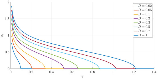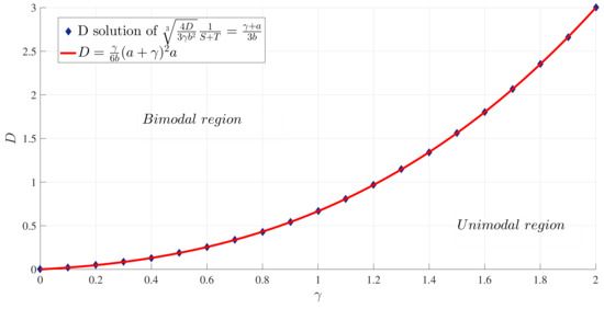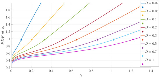 To illustrate these results, Figure 1 and Figure 2 show how the peak position and peak amplitude , respectively, vary with for a range of D values. Figure 3 shows the boundary between the unimodal and bimodal PDFs in the parameter space. These results are for , but other values yield the same general boundary shapes, and in particular, the same agreement occurs between the two different evaluation methods, and (33). The condition is therefore a necessary and sufficient condition to have a bimodal PDF. Figure 4 shows what the PDFs look like and how the transition between unimodal and bimodal PDFs comes about.