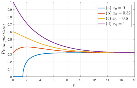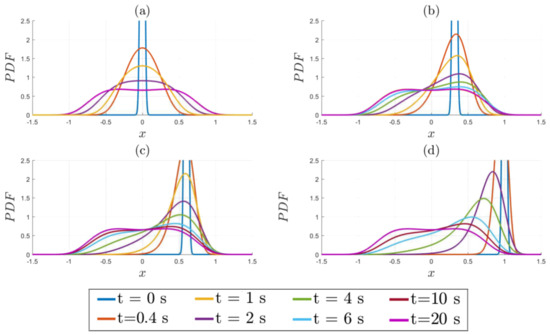 Figure 5 shows examples of how different values of ultimately all relax to the same final PDF. Panels (a–d) correspond to , respectively. , according to Figure 3, is slightly in the bimodal regime, consistent with the final PDF seen here. Figure 6 focuses specifically on how the positions of the peaks evolve in time. Important observations that we can make from Figure 5 and Figure 6 are as follows: