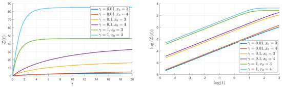 Letting denote the numerically computed slope (for small t), the left panel shows as a function of , for , and the right panel shows as a function of for . The agreement with the expectations from Equation (17) is seen to be reasonably good.