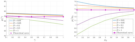 where the first and second terms on the right-hand side are due to the temporal changes in the width and peak position of the PDF. For sufficiently small D (large ) and/or large , in Equation (13) is dominated by the second term. Furthermore, with a small D, Equation (11) becomes . Thus, by substituting , into Equation (13), we obtain