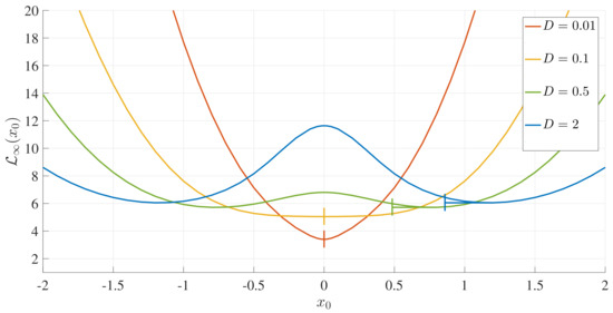 is a unique representation of the total number of statistically different states that a PDF evolves through to reach a final unimodal or bimodal PDF. The smaller is, the smaller the number of states that the initial PDF passes through to reach the final equilibrium. Therefore, provides us with a path-dependent Lagrangian measure of the distance between a given initial and final PDF. Thus, by choosing a narrow initial PDF at different peak positions (), we can map out the attractor structure (the proximity of to an equilibrium) by measuring as a function of . We were particularly interested in how differently would behave for the final unimodal and bimodal PDFs, which have different stable equilibrium points: and , respectively. To this end, Figure 9 shows as a function () for a range of D values. For final bimodal PDFs, the location of the final peak position () is shown by a little vertical line.