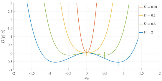 We note first in Figure 9 that the overall shapes of the curves are drastically different depending on whether the final PDF is unimodal or bimodal. For a unimodal final PDF, the minimum value of occurs for . This is because is a stable equilibrium for a unimodal PDF and thus, an initial PDF with the peak () closer to undergoes less change during the evolution of time and is more similar to the final PDF. Therefore, the absolute minimum of occurs at , as can be seen in the orange and yellow curves in Figure 9.