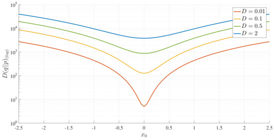 For completeness, we also show in Figure 11. Unlike Figure 10, the absolute minimum value occurs at , even when the final PDF is bimodal, failing to capture the attractor structure associated with a bimodal PDF. Furthermore, the values of are much larger than those of , and thus, a symmetric version () would be dominated by . This drastic difference between and calls for care in using symmetric versions.