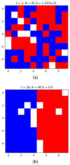 Figure 3 displays the placement of the residents in the lattice at 2 different time points in the simulation of the Schelling model. Subfigure (a) shows the state at the initialization where and the entropy calculated using Equation (8) is = 1.207 × 10. Subfigure (b) shows the resulting state of the lattice after the R value no longer changes and in this case the maximum possible value has been reached for this model setup (). At the entropy is found to be which denotes that the number of microstates for this macrostate is 1. With no uncertainty about the microstate given the macrostate this number is understandable given that a number of 1 observation was provided for each possible observation in the Monte Carlo simulation. Since there were no microstates drawn for , the density remained at 1 which produces zero entropy.