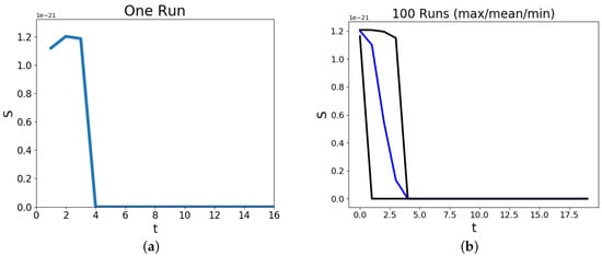 Figure 4 presents the entropy values estimated for the time steps in the Schelling model simulations. Each run is began as an independent initialization of the grid for 2 groups of residential members with 45 residents and 10 empty in a 10 × 10 lattice. These figures provide insight into the entropy values the simulation produces by state changes between iterations. The entropy values, , are found from Equation (8) and are computed for each simulation independently. Subfigure (a) displays the trace of values for a single simulation. The rise and then decrease shows that the random allocation of residents by uniformly allocating new positions for those with less than the threshold of necessary homogeneity does not guarantee a macroscopic aggregate state of entropy or R (as displayed in a) of Figure 1. The zero entropy state is what the simulation arrives to and remains at, as there is only a single microstate member counted for that value of R. From the progression of R in Figure 1 and the distribution of the sampled values of R in Figure 2, it can be seen that the larger R values the Schelling dynamics produces are of a smaller ensemble which results in the decrease in entropy. Subfigure (b) shows the results from 100 independent simulations where the maximum, mean and minimum values of the entropy (Equation (8)) are drawn. All the simulations reach the zero entropy and it can be seen how some simulations arrive at that value requiring less or more time points. This can be due to the initializations and the sequence of random allocation of moving residents.