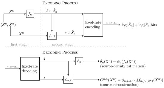 where and are finite-set functions of n. processes in two stages. In the first stage, the pair in (13) uses to do density estimation and finite-rate encoding (quantization) by , and decodes an estimated density in . At the end, the first stage provides a quantized estimation of given by