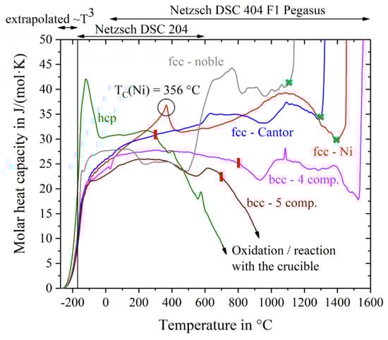 Molar heat capacities of pure nickel and five high entropy alloys. Green crosses indicate TS, red lines show the beginning of oxidation or reactions with the crucible that make the data not evaluable.