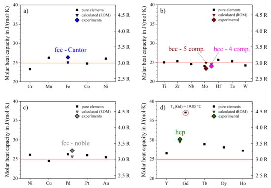 Molar heat capacities at room temperature of the investigated alloys, both experimental and rule of mixture (ROM) data for (a) fcc-Cantor, (b) both bcc-alloys, (c) fcc-noble and (d) the hcp-alloy. Values for pure elements were taken from []. The red line indicates the Dulong-Petit law with cp(RT) ≈ 3·R.