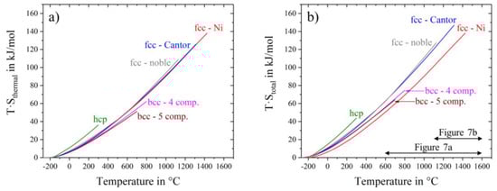 Contribution of thermal entropy (a) and total entropy (b) of nickel and all high entropy alloys to Gibbs free energy. The horizontal arrows refer to Figure 7 with magnified details of a special temperature range.
