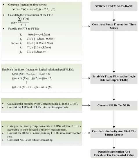 This paper presents a prediction model that is based on high-order fluctuation trends and information entropy. Different from existing high-order fuzzy time series forecasting models, the proposed model summarizes the discrete high-order fluctuation states into truth-membership of upper-trend, falsity-membership of upper-trend, and chaos of trends. It coincides with the definition of neutrosophic set, which employs the three dimensions of truth-membership, falsity-membership, and indeterminacy-membership to describe a characteristic. Based on the NS expression of high-order fluctuation states, the NS theory can be used to deal with related issues, such as the comparison of high-order states during the location of rules. The most significant contribution of this model is that it extends existing high-order fuzzy logical relationships to neutrosophic logical relationships and it employs information entropy to represent the indeterminacy of fluctuation trends. When compared with traditional discrete high-order FLRs, the proposed NLRs have higher generality and can handle the problem caused by the lack of rules in the forecasting stage. The detailed steps are shown as follow steps and in Figure 1.