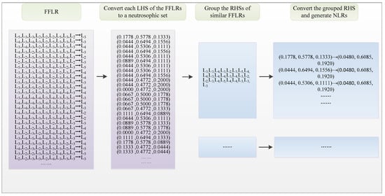 Firstly, apply the Jaccard similarity measure method to categorize and group the converted LHSs of FFLRs. In this example, the threshold similarity value is set to 0.94. Then, convert the RHSs of the corresponding FFLRs into neutrosophic sets according to Equation (7). The conversion and grouping process is shown in Figure 2.