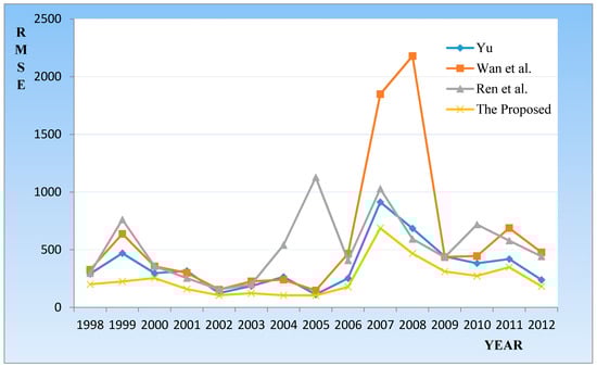 Table 3 shows the prediction errors for different methods from 1997 to 2005. By comparing with the latest research, we found that the overall prediction effect of this method was excellent. For example, the average error of Guan et al.’s model [40] is 94.5, the average error of Cheng et al.’s model [41] is 102.4, and the error of the proposed model is 92.16. Upon further analysis, from the annual prediction error results, we can see that this method can effectively predict the trend from 1997 to 2005, which is more universal.