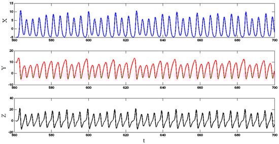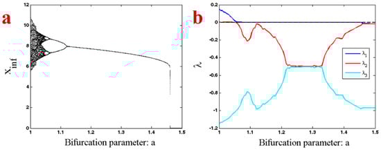 In order to show the different dynamic behaviors of System (1), its bifurcation diagram was investigated. Figure 4a shows a bifurcation diagram of the system with respect to the changing parameter . The system has an inverse route of period doubling after its chaotic behavior. The dynamic of the system also suddenly changes in from a stable limit cycle to a stable equilibrium. In other words, System (1) has a chaotic attractor in parameter and initial conditions . The system also has a stable equilibrium point in . Thus, there are some initial conditions in the vicinity of this stable equilibrium that are attracted to it. In the bifurcation diagram of Figure 4, we used the initial conditions for parameter and applied the forward continuation method for the higher values of parameter . In other words, in the higher values of parameter , we used initial conditions from the end of trajectory in the previous parameter with forward changing. Thus, the trajectory of the system traps into one attractor that is chaotic in parameter and bifurcates with an inverse route of period doubling to chaos. In parameter the previous attractor becomes unstable and the system jumps from a stable limit cycle to the stable equilibrium point . To be sure about the chaotic and other types of attractors of the system, it was necessary to calculate the Lyapunov exponents (Figure 4b). In the smaller values of the parameter the system has a chaotic attractor (one positive, one zero, and one negative LE). It then shows the limit cycle, since its largest Lyapunov exponent is zero and the other two LEs are negative. After that, in the higher values of parameter , the attractor changed to a stable equilibrium that has three negative Lyapunov exponents.
