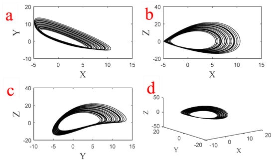 Three projections of the chaotic attractor of System (1) with parameter and initial conditions in (a) X-Y plane. (b) X-Z plane. (c) Y-Z plane and (d) 3-D chaotic attractor.