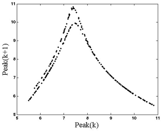 Poincaré map (peaks of x variable) of System (1) with parameter and initial conditions .