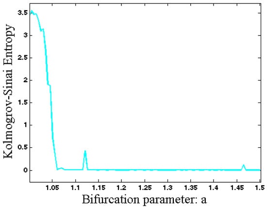 It is defined using the first Poincaré recurrence times (FPRs) denoted by . is a D-dimensional box in the state space with side where the FPRs are observed. is the probability distribution of . For a smooth chaotic system is equal to the sum of all positive Lyapunov exponents [,]. The Kolmogorov–Sinai entropy of System (1) with respect to the changing parameter is shown in Figure 5. Near a bifurcation point, the system’s state becomes slower. In other words, the transient time increases near a bifurcation point [,]. In order to use Kolmogorov–Sinai entropy to anticipate a bifurcation point, we calculated it without removing the transient time of the trajectory. If we remove the transient time, then the estimated Kolmogorov–Sinai entropy became zero in regular dynamics and it changed through variations in the final state of the system. By applying Kolmogorov–Sinai entropy to the system’s state without removing transient time, we were able to see complexity of transient parts as well as final state of the system. As Figure 5 shows, in small values of parameter the system has a chaotic attractor and its unpredictability is high. By increasing parameter , the system changes its dynamic to a regular dynamic and thus its entropy decreases. However, in the bifurcation points the system becomes slower and its transient time increases. That is the reason for the increasing entropy in the bifurcation points.