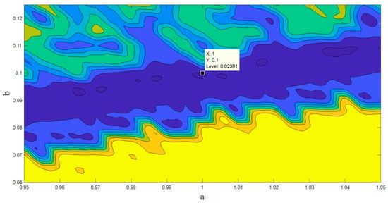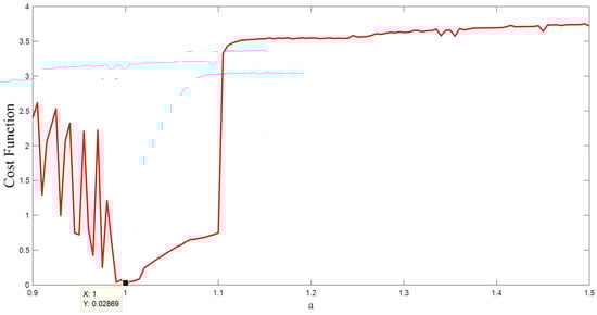 There are various methods for parameter estimation in dynamic systems that are based on optimization methods [,,]. The basis of these methods is a cost function associated with the differences between the time series obtained from a real system and the time series obtained from a known model with unknown parameters. However, these approaches are not appropriate for chaotic systems due to the butterfly effect [,,]. Therefore an alternative method is proposed in [,]. This new method changes the analyzing domain of the chaotic system from time space to the state space. In the other words, this new model compares the topology and structure of the points in the state space. To this end, the algorithm searches the space of the parameter to find the most similar point from the model to the point of the data. Whenever the structure of the points in the state space gets close enough to the structure of the real data, the optimum parameter is found. For more complete details, see [,]. In this paper, we used this useful cost function along with WOA (whale optimization algorithm [,]) for the parameter estimation method. Figure 6 shows the result of the cost function with respect to changing the parameter . As is shown in the figure, the global minimum is located exactly in the main parameter . Figure 7 shows the result of the cost function with respect to changing the parameters and b (consider b as the coefficient of in the third equation of Equation (1)). As is shown in the figure, the global minimum is located in the main parameters .