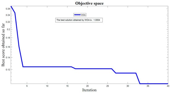 At first, the algorithm determines the best candidate solution. Then it updates the position of the other points in order to get closer to the best agent. The second step is about the attack strategy, which can be divided into two approaches. The first is a shrinking encircling mechanism and the other is a spiral updating position. For complete details see []. Figure 8 represents the result of the WOA for the 30 searching agents and 40 iterations.