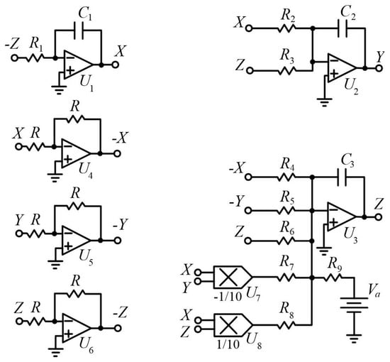 This section presents a circuit implementation for the three-dimensional flow (1) (see Figure 9). The circuit implementation in Figure 9 was constructed using six operational amplifiers and electronic elements [,,,,]. We used TL084 operational amplifiers and AD633 analog multipliers. Taking the voltages of three operational amplifiers as , it confirms that the circuit in Equation (6) corresponds to the flow (1):