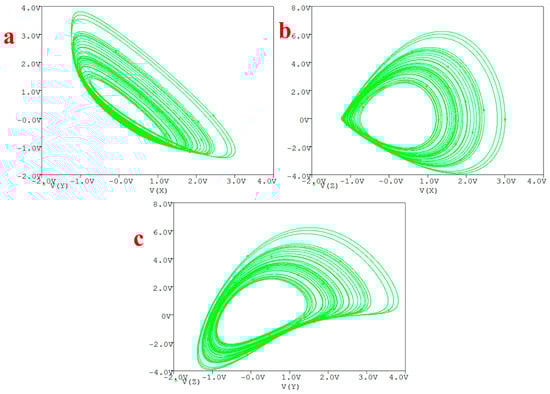 Generated attractors in PSpice of the circuit: (a) X-Y plane, (b) X-Z plane, (c) Y-Z plane.