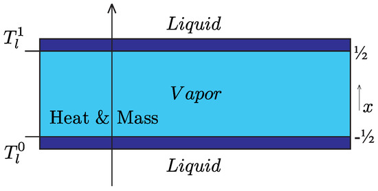 In the first problem for fitting the coefficients and also for gaining insight into the Knudsen layers, we consider one-dimensional, steady-state heat and mass transfer within a vapour phase in between two liquid reservoirs with controlled temperature on the liquid side of the liquid-vapour interfaces. The configuration shown in Figure 1 has been discussed in [11] and shall be outlined only briefly here.