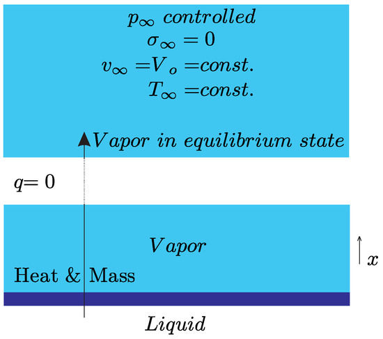 The six unknowns are found by considering evaporation boundary conditions on one side and constant velocity , pressure and temperature far away from the interface. For reaching constant pressure and due to the momentum balance (38), it is necessary to set the normal stress far away from the interface to . Moreover, conductive heat flux is set to zero, as well. With prescribed, one finds the constant K. For (50) and (51), it follows:
