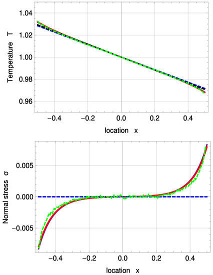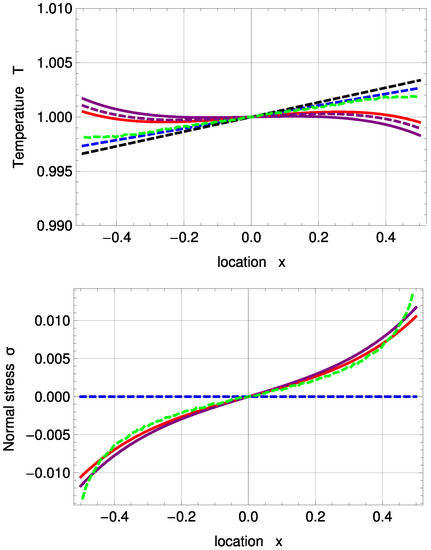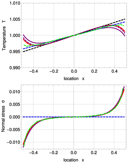 Figure 3 shows temperature and normal stress profiles for . R13 with PBC (solid, purple) and MBC (solid, red) are in good agreement with DSMC (green, dashed). The amplitude of the Knudsen layer A is zero for NSF (black, dashed) and corrected NSF (blue, dashed). As a result, both NSF solutions slightly deviate from DSMC close to the boundaries. removes the last term in (51) and therefore leads to a linear function. In Problem I, NSF is not able to predict normal stress at all; see Equations (55) and (56).