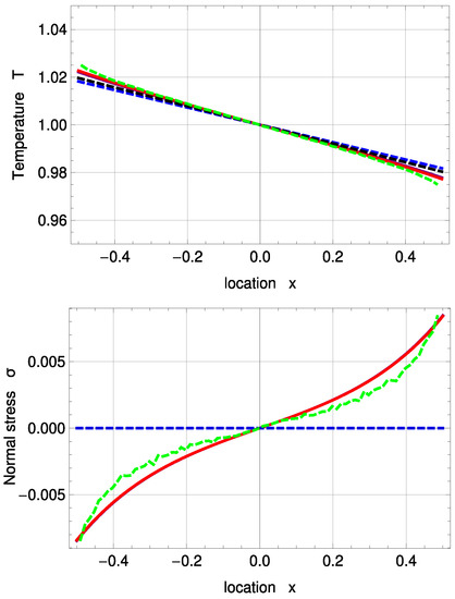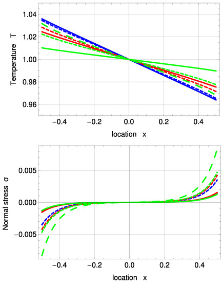 Since appears only in the equation for the normal velocity, it has a strong impact on and no impact on the conductive heat flux . Apparently, it has no impact on the boundary normal stress . Temperature and stress profiles appear to be independent of as well. The coefficient has a big impact on and and a small impact on . It has a major impact on the temperature profile and a smaller impact on the stress profile. strongly influences and and very slightly . Since does not appear in the equation for , this is expected. It has an impact on temperature and stress profiles, but with clear emphasis on the stress profile.