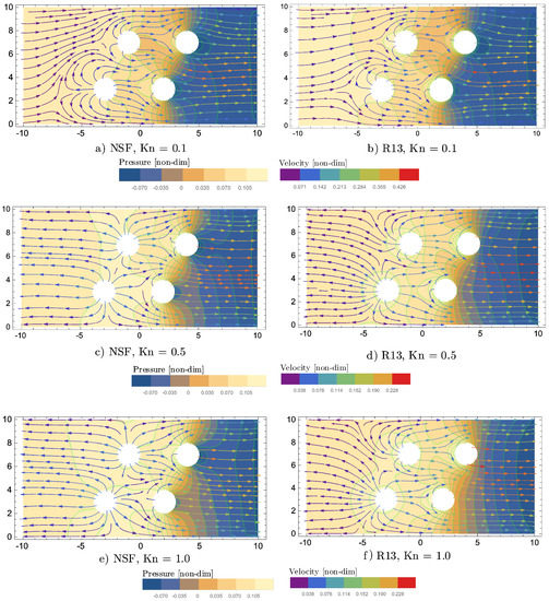 The plots in Figure 12 show pressure contours, superimposed by velocity streamlines, for R13 and NSF, for the three Knudsen numbers: .