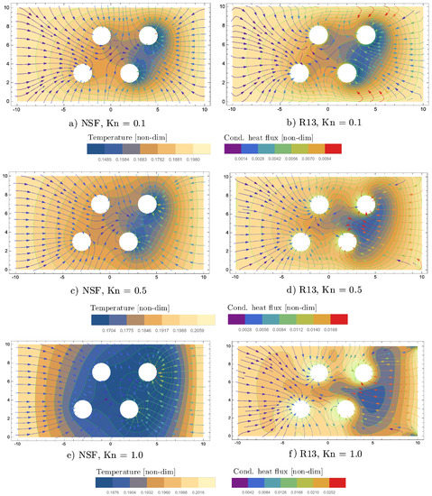 The overall temperature around the four evaporating cylinders is much lower for NSF than for R13. As can be seen by the conductive heat flux streamlines, the enthalpy of vapourization is provided by the boundaries, as in the previous simulations. The magnitude of the R13 heat flux shows interesting peaks in between the two cylinders on the right-hand side for .